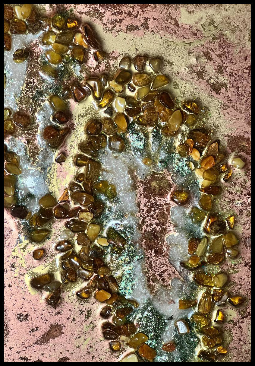 Wo Natur auf Kunst trifft: Olga-Maria verwandelt ausgewählte Kristalle und Mineralien in meditative Energiebilder. Jedes Kunstwerk ist ein Unikat – Steine in Harz gegossen, die in irisierendem Glanz erstrahlen.