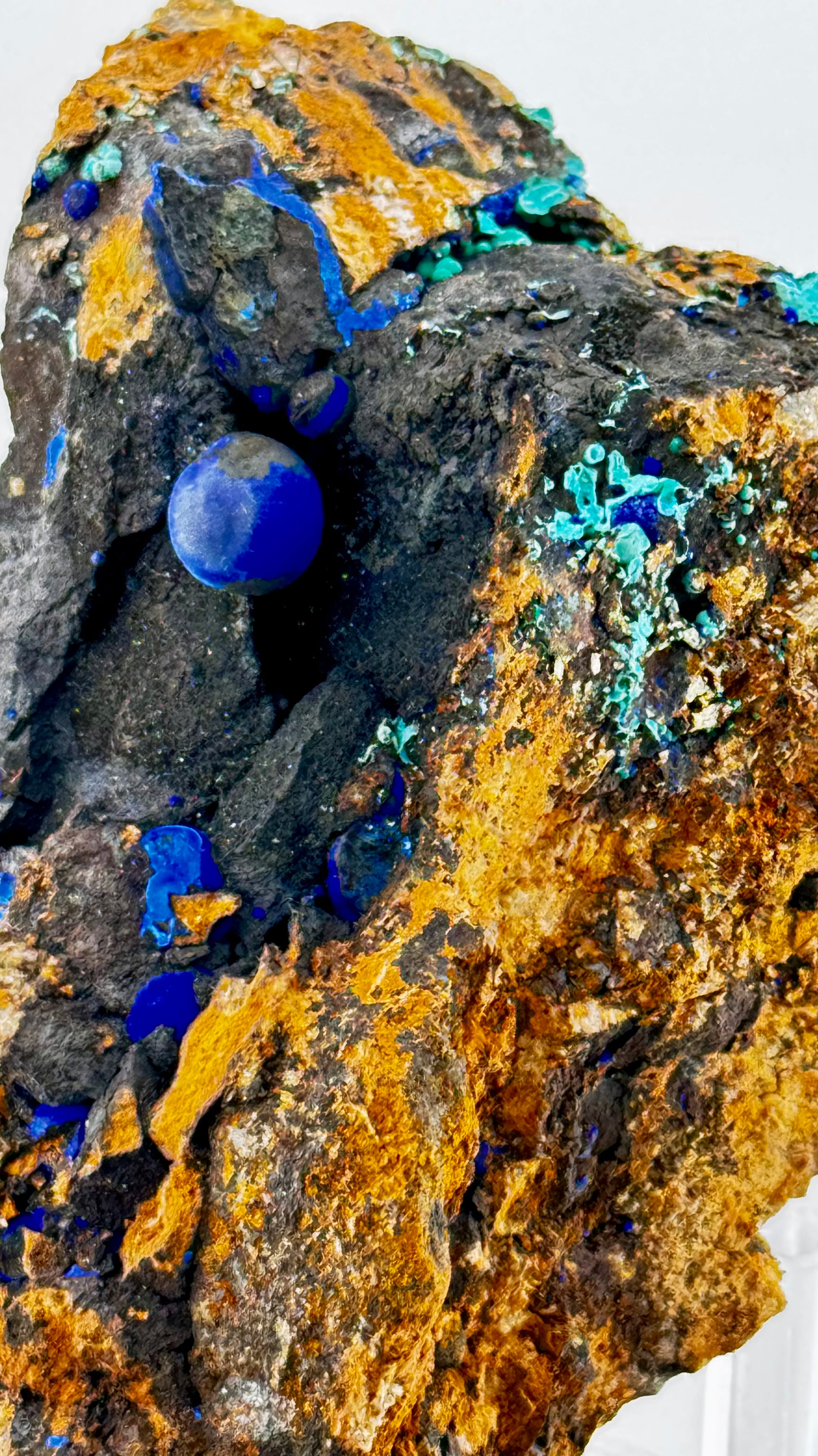 Um die zentrale Kugel herum wachsen kleinere Azurit-Bereiche und türkisgrüne Malachit-Krusten. Die Farbpalette reicht von tiefem Kobaltblau über helles Azurblau bis zu intensivem Türkisgrün – alle Schattierungen der Kupfercarbonate in einer Stufe vereint.