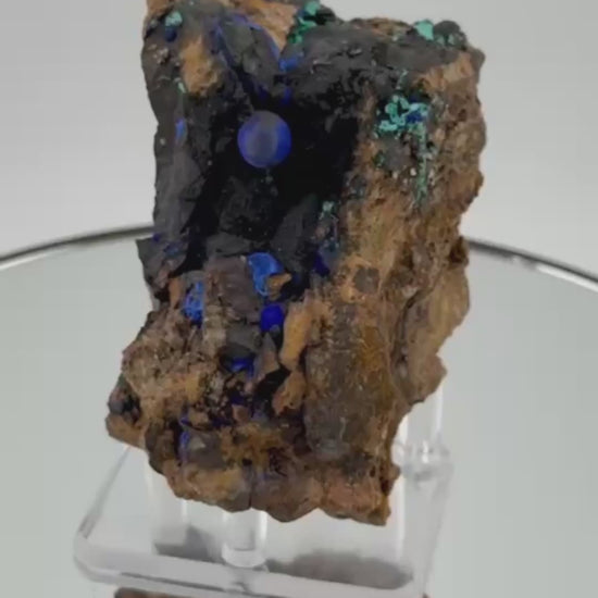 Solche Formationen sind deutlich seltener und begehrter als einfache Azurit-Krusten. Die perfekte Rundung und der intensive Glanz machen diese Kugel zum visuellen Zentrum der Stufe.