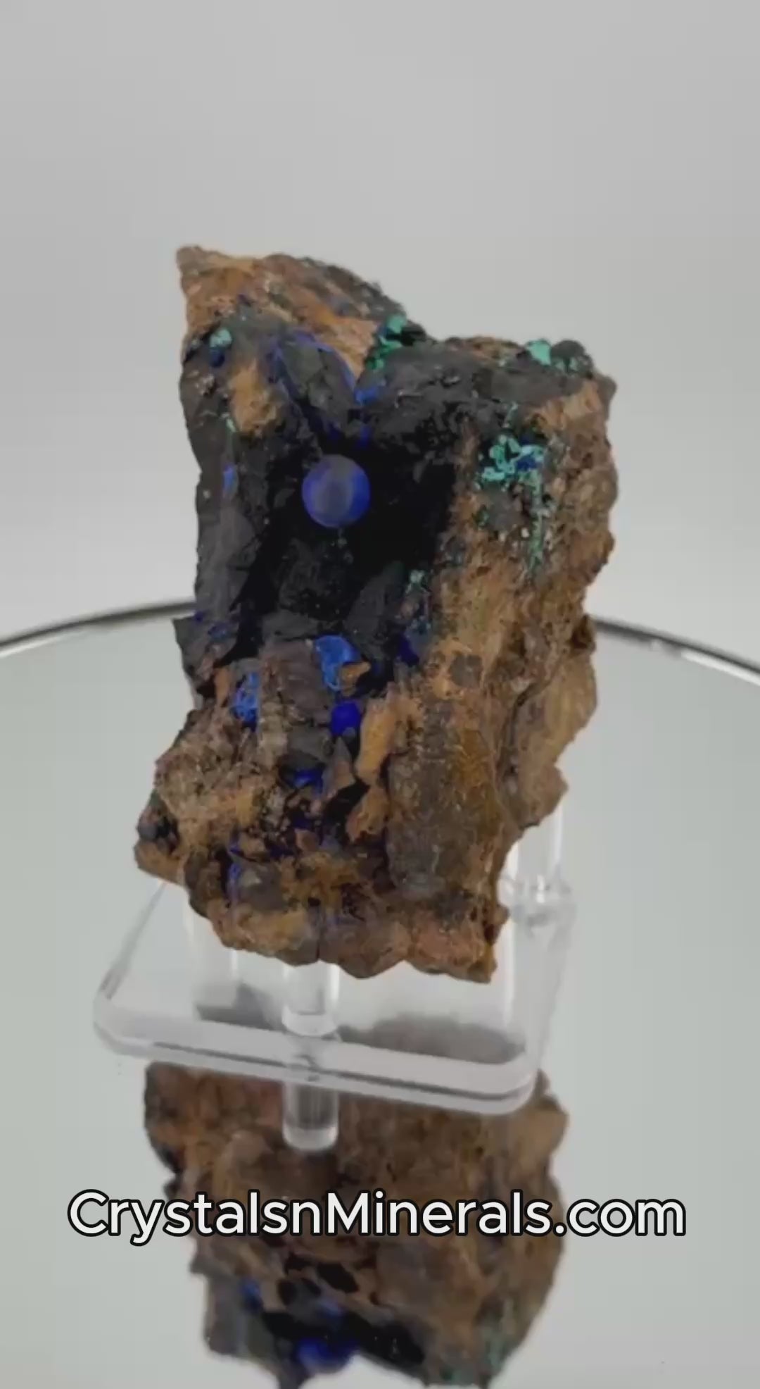 Azurit und Malachit sind mit Mohshärte 3,5-4 relativ weich und empfindlich. Mit weichem, trockenem Pinsel abstauben. Nicht mit Wasser reinigen – Malachit kann bei Feuchtigkeit Flecken entwickeln, Azurit kann oxidieren.