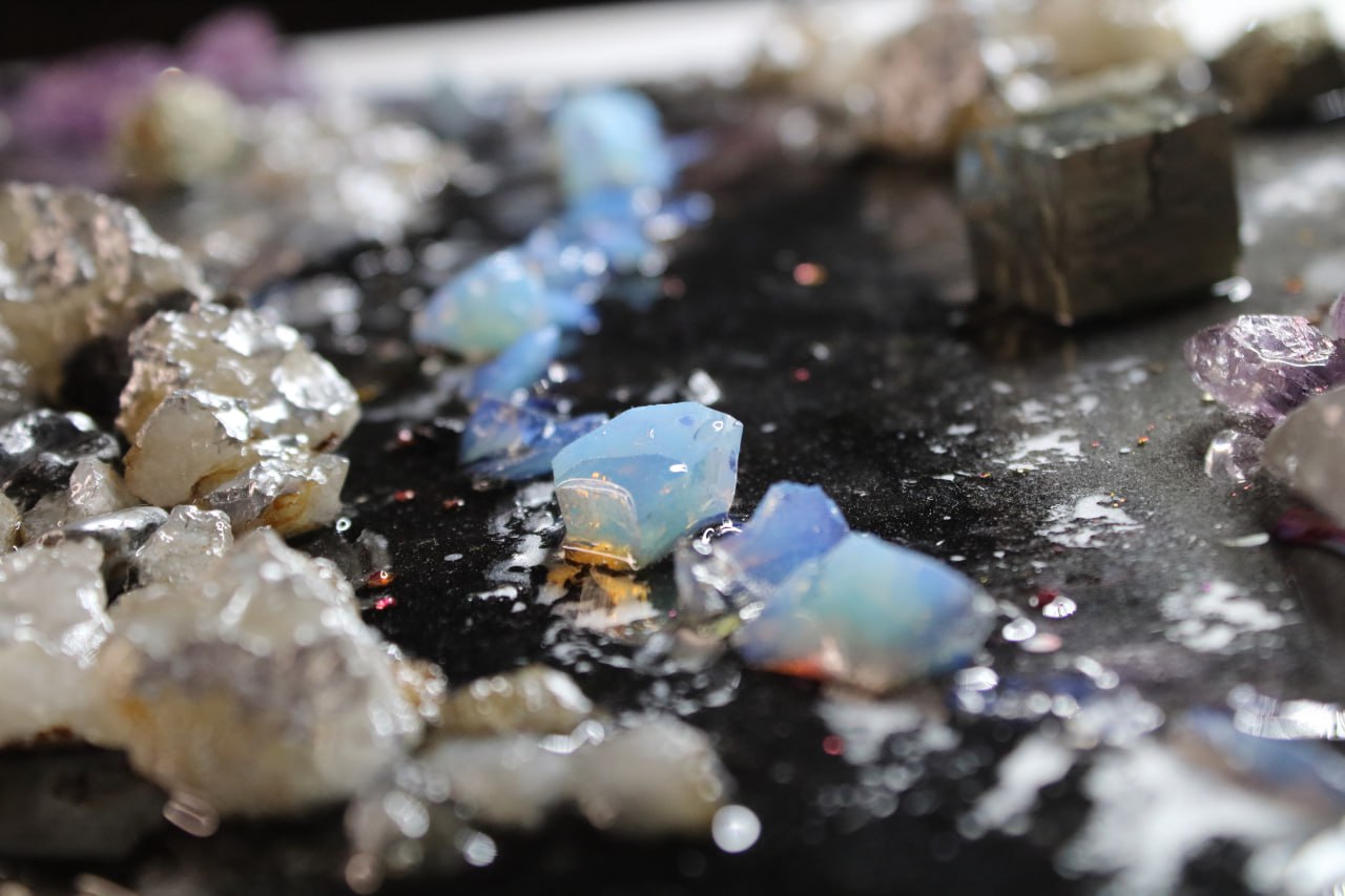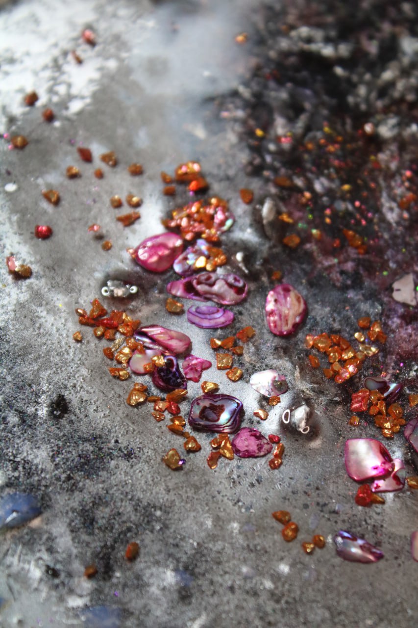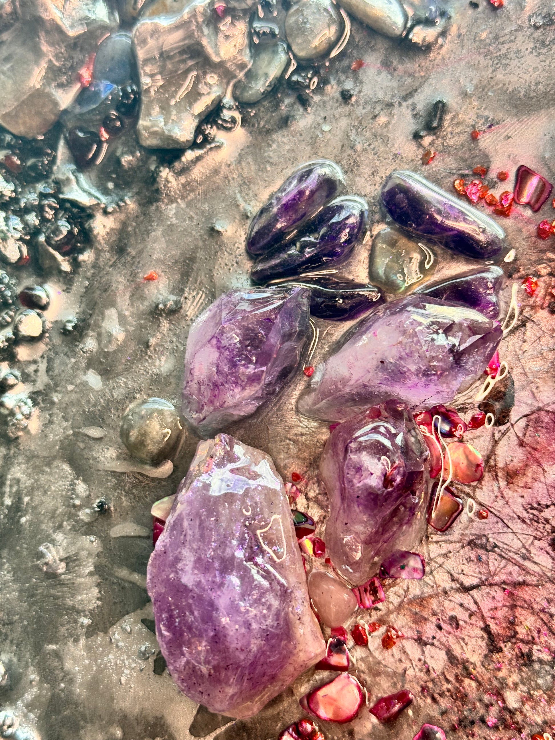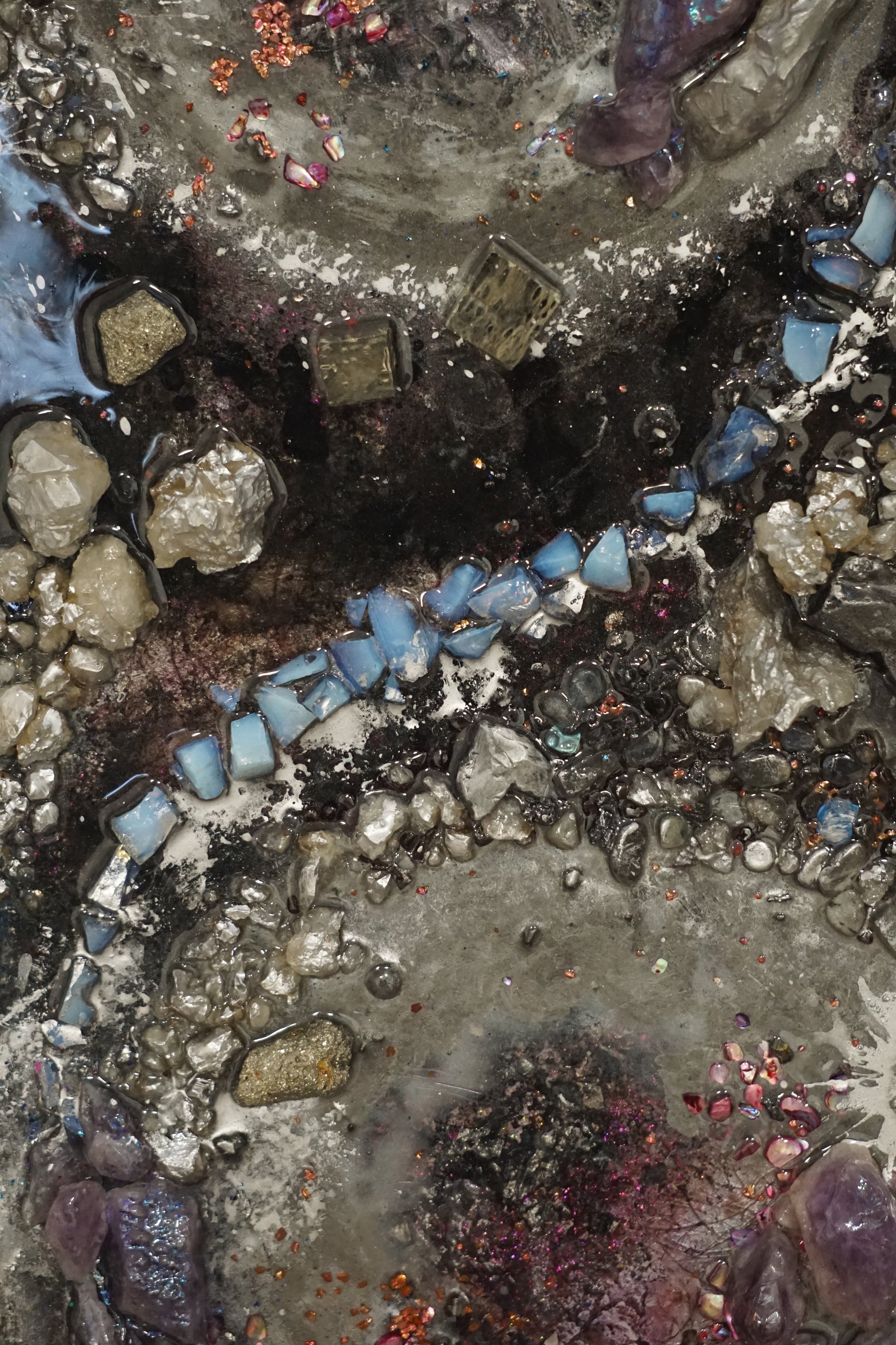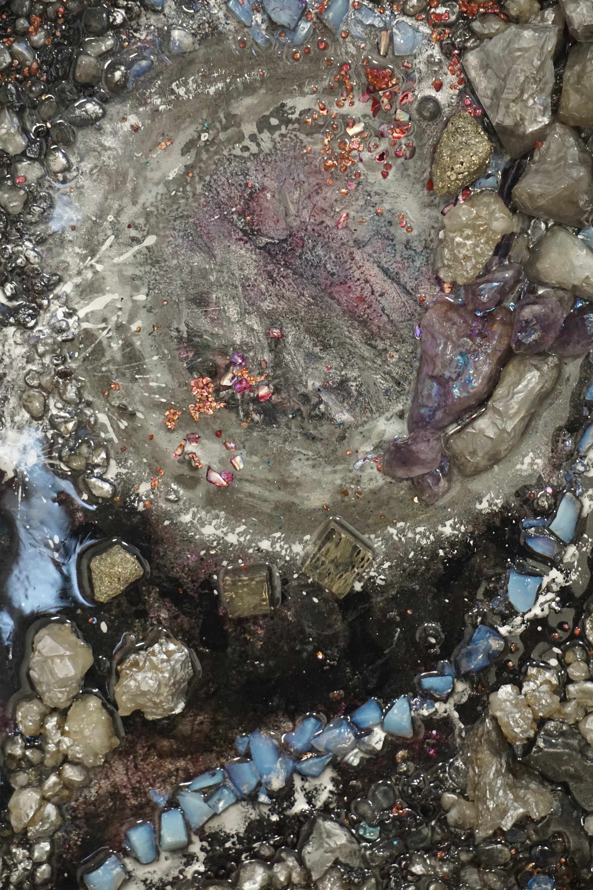 Eine Resin-Komposition, die die griechische Sage der Dioskuren – Castor und Pollux – in abstrakte Bildsprache übersetzt. Auf 70 × 30 cm werden zwei kreisförmige Zentren durch organische Farbverläufe miteinander verbunden, eingebettet mit natürlichen Kristallen: Bergkristall, Pyrit, Lava-Gestein, Mondstein, Amethyst, Feuerstein und Rubin.