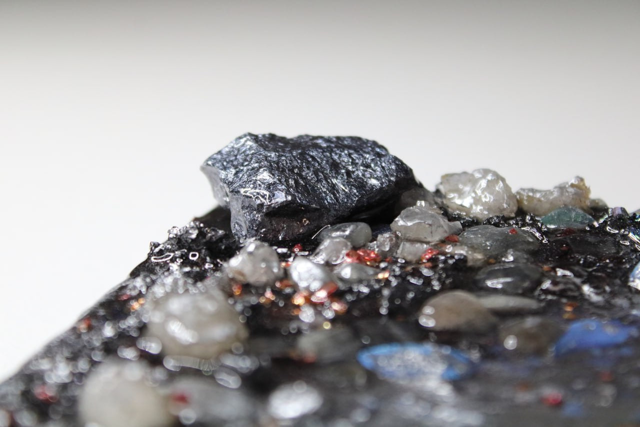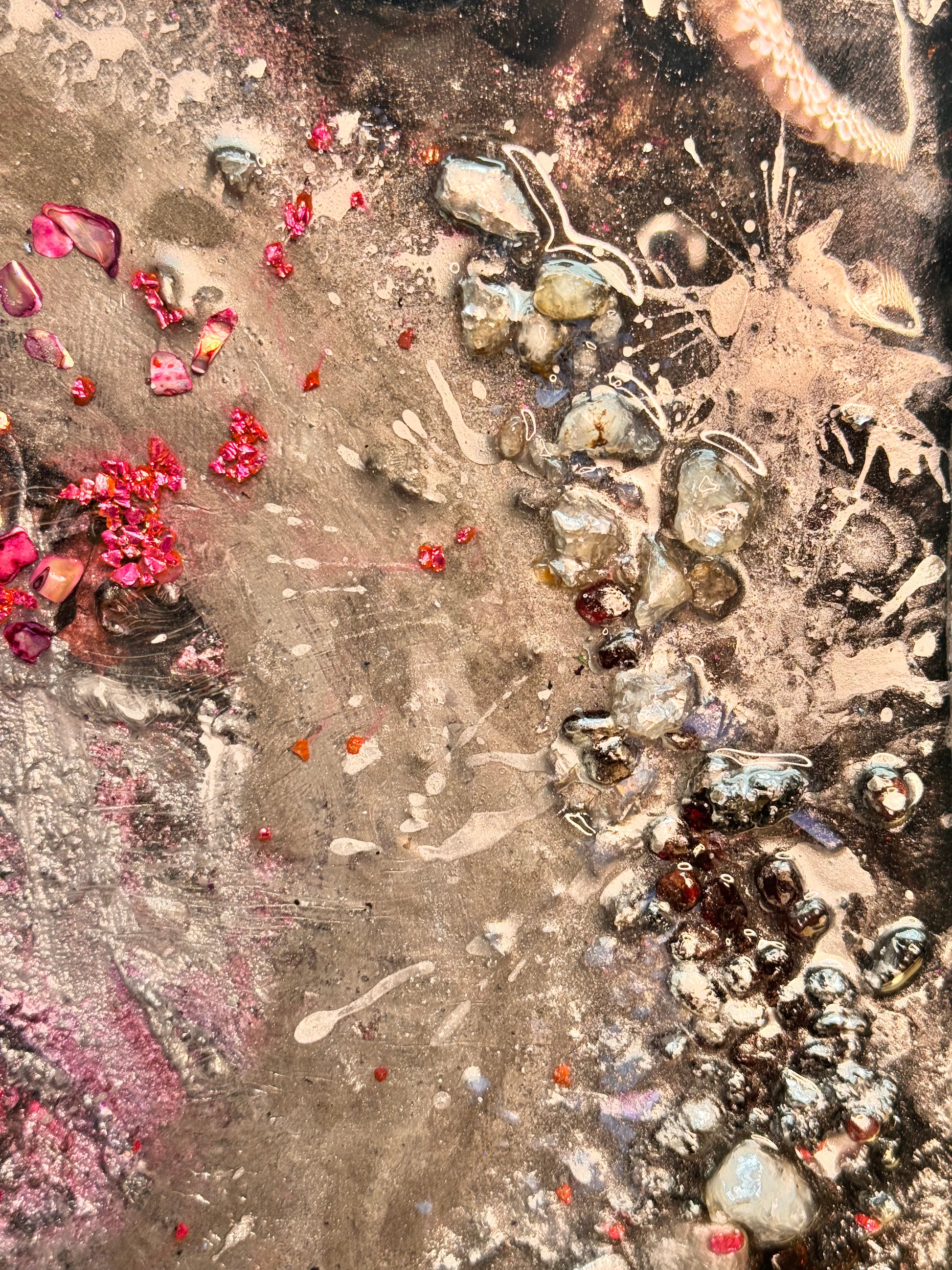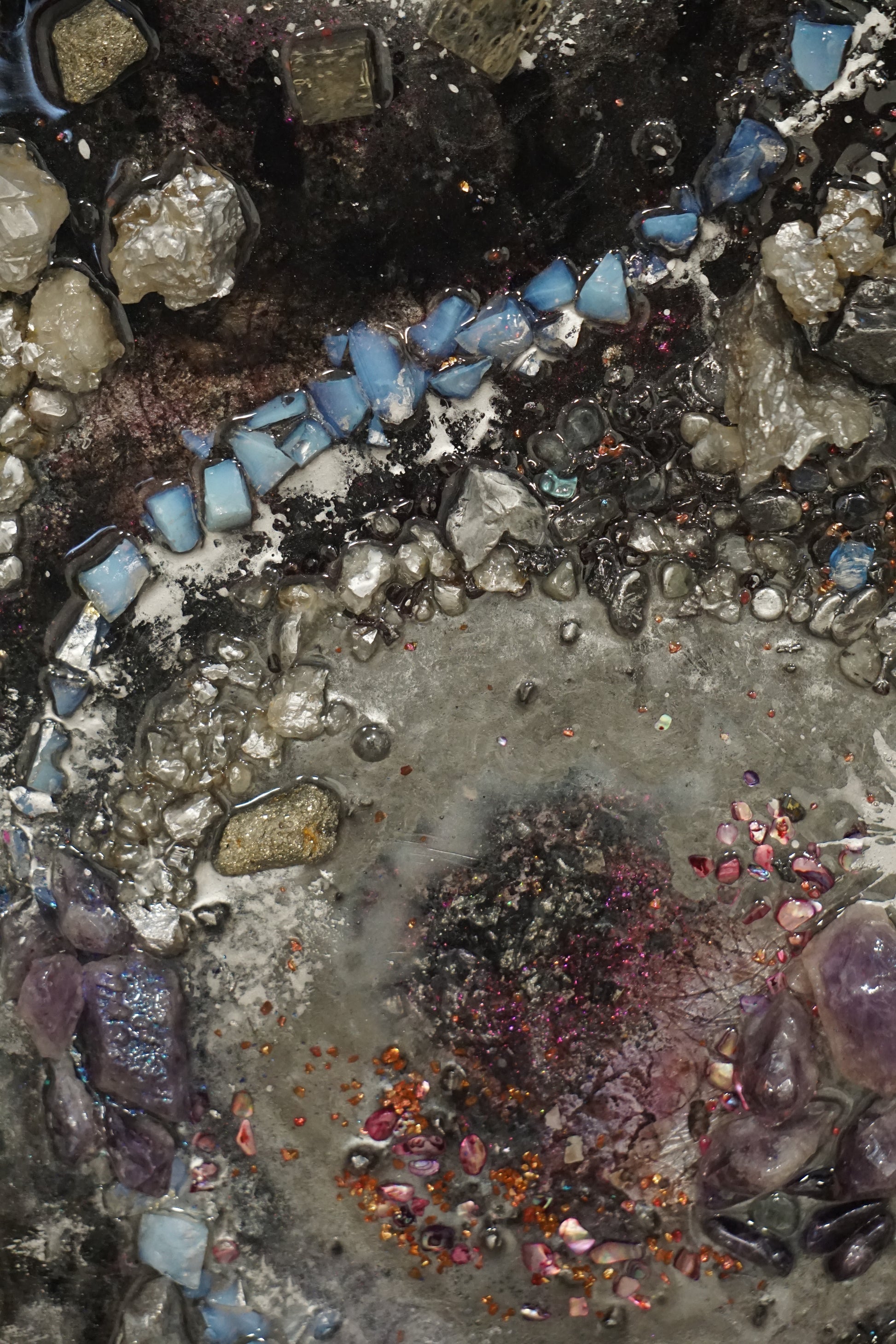 Das Werk arbeitet mit dieser Dualität: Zwei Kreise, unterschiedlich in Farbe und Materialzusammensetzung, aber visuell verbunden durch Goldakzente und gemeinsame kristalline Strukturen. Die verwendeten Mineralien – von transparentem Bergkristall über metallischen Pyrit bis zu tiefrotem Rubin – erzeugen Kontraste und Verbindungen zugleich. Keine symbolische Illustration, sondern eine zeitgenössische Interpretation von Verbundenheit und Dualität.