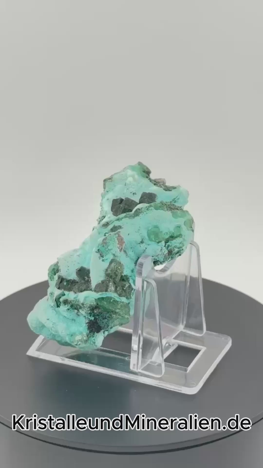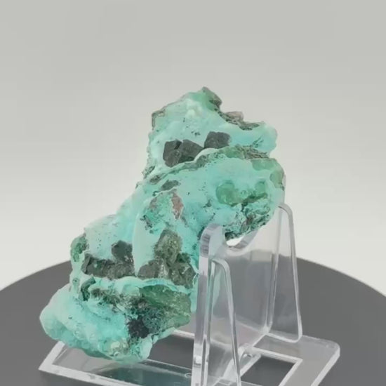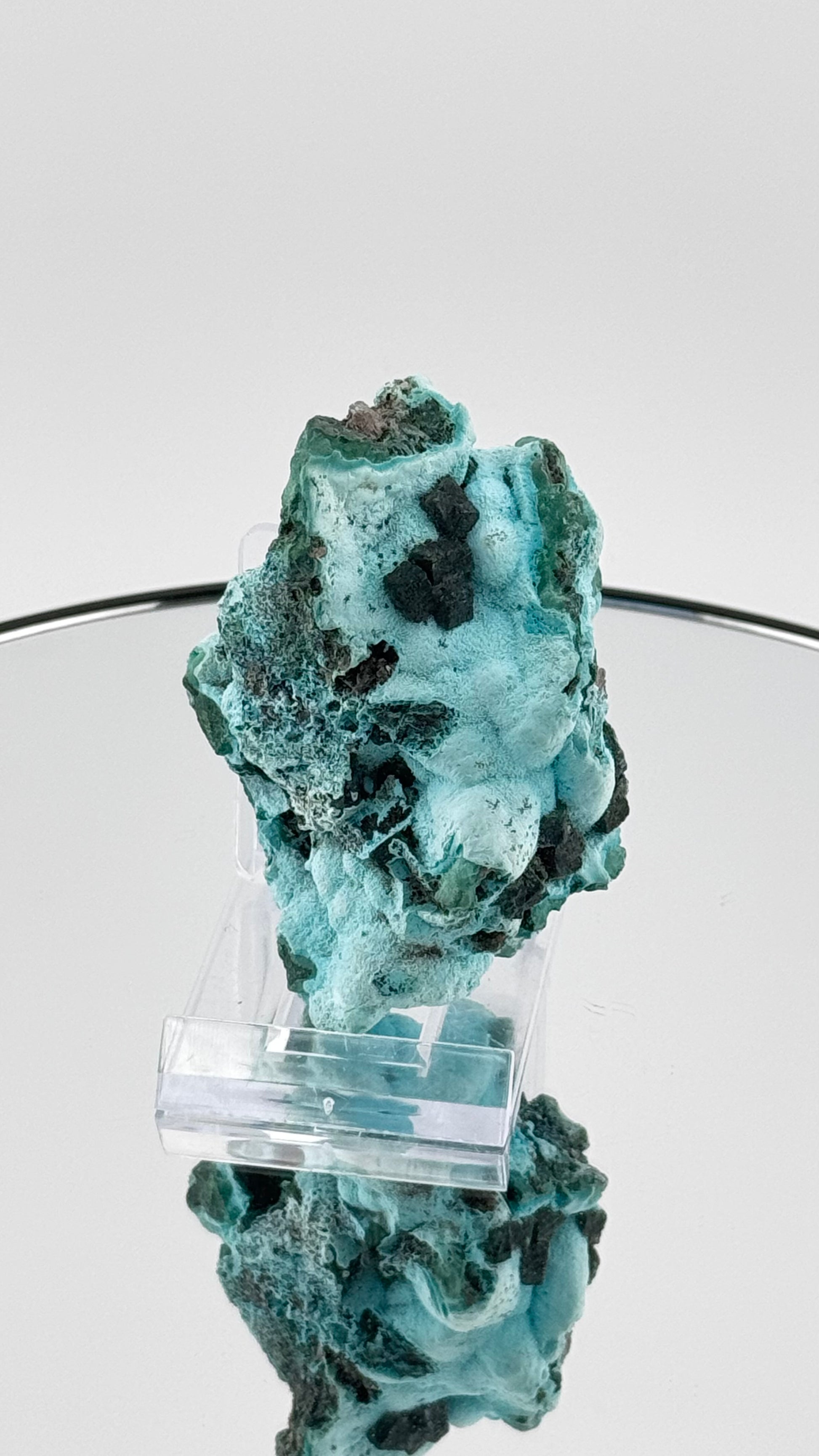 Die Oberfläche zeigt ein faszinierendes Farbspiel: Helle, fast aquamarinblaue Chrysokoll-Zonen wechseln sich mit intensiv türkisfarbenen Bereichen ab, während kleine, dunkel smaragdgrüne Dioptas-Kristalle wie Edelsteine auf der Matrix funkeln. Die schwarzen Einschlüsse setzen dramatische Akzente und unterstreichen die vulkanische Entstehungsgeschichte.