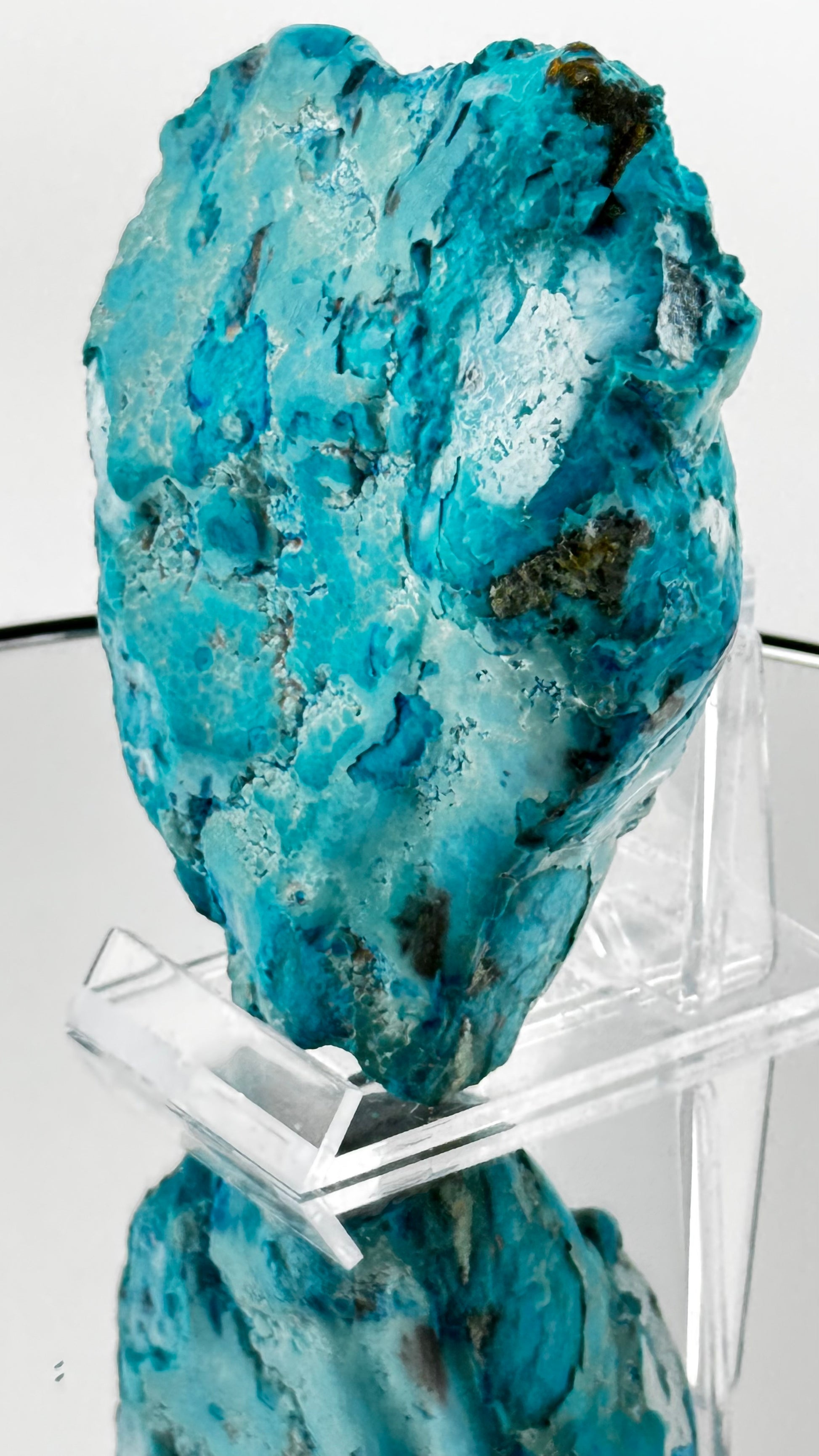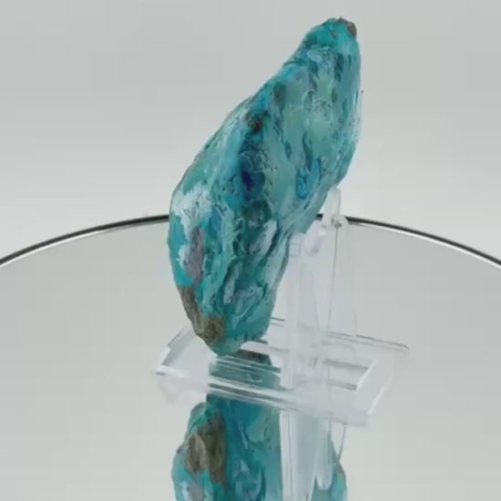 Ein außergewöhnliches Sammlerstück aus dem Kongo mit intensiven Türkis- und Azurblau-Tönen, die für kongolesischen Chrysokoll charakteristisch sind. Diese Stufe zeigt die typische traubige Oberfläche mit natürlichen Maserungen und metallischen Akzenten. Die Kombination aus leuchtendem Türkis, dunkleren Einschlüssen und silbrigen Reflexen macht jede Betrachtung zu einem visuellen Erlebnis.