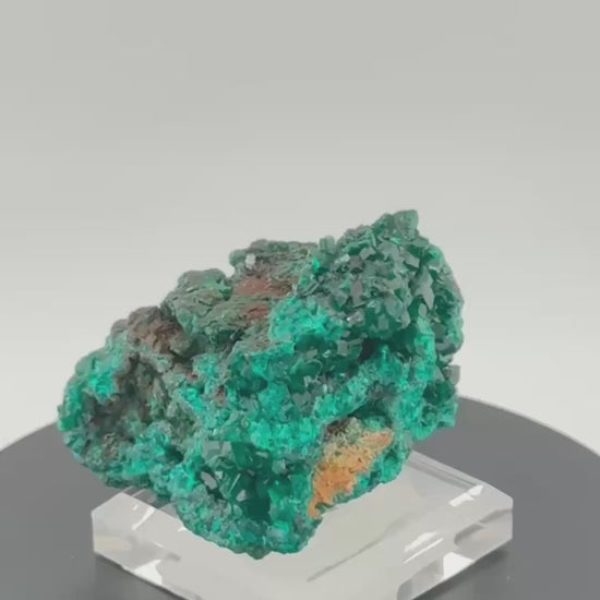 Unter direkter Beleuchtung entfaltet Dioptase seine volle Brillanz: Der Glasglanz der Kristallflächen reflektiert das Licht wie geschliffene Edelsteine. Die dreidimensionale Hohlraum-Struktur verleiht der Stufe Tiefe und macht sie von allen Seiten interessant.