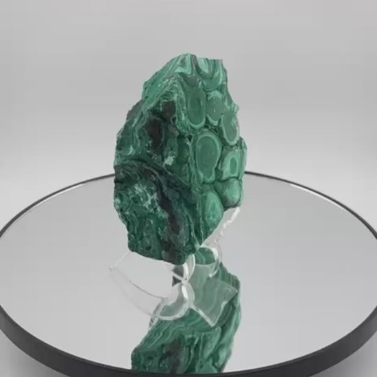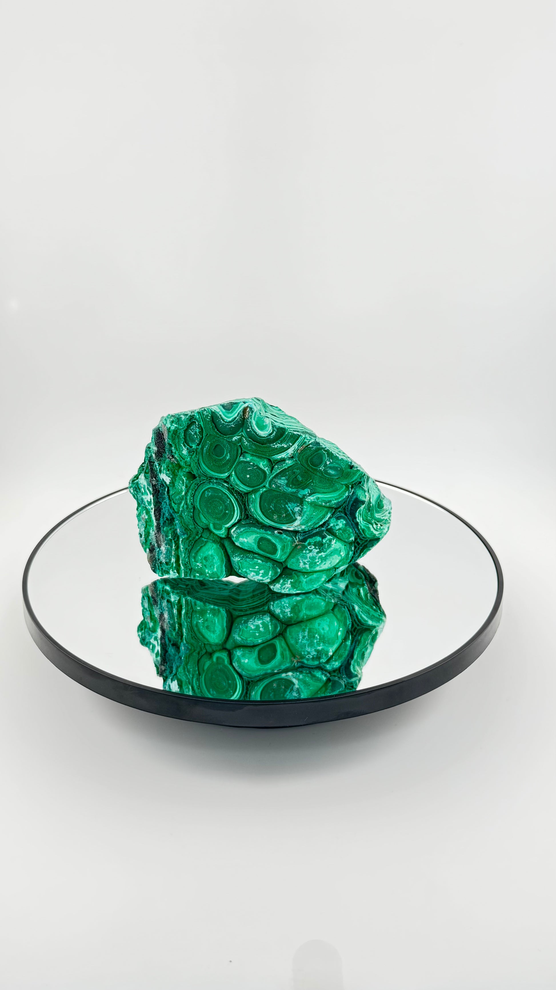 Kongolesischer Malachit ist weltweit für seine unübertroffene Farbsättigung bekannt. Dieses Exemplar zeigt die volle Bandbreite: von hellen, fast türkisfarbenen Tönen über leuchtendes Grasgrün bis zu dunkelgrünen Akzenten. Die Kombination mit der dunklen, rauen Rückseite verstärkt die visuelle Wirkung der polierten Vorderseite.