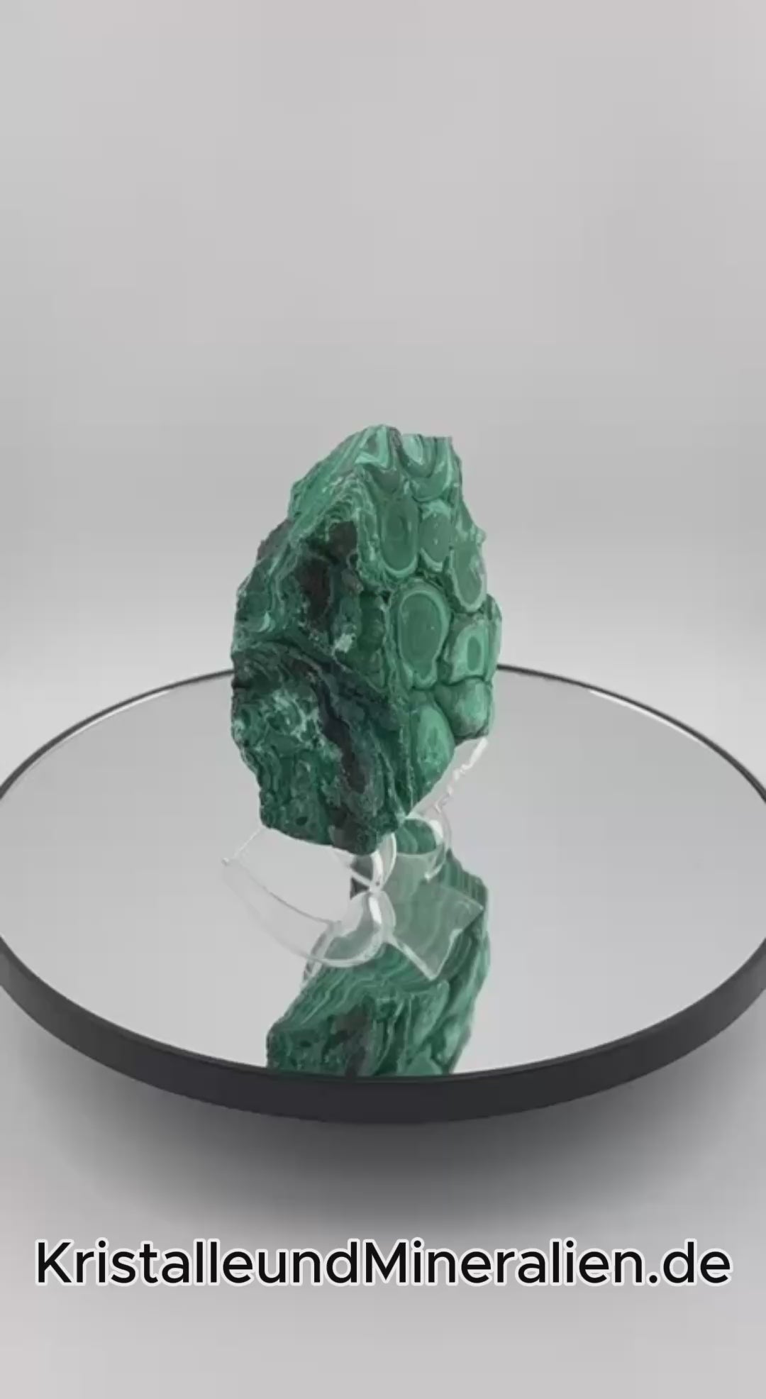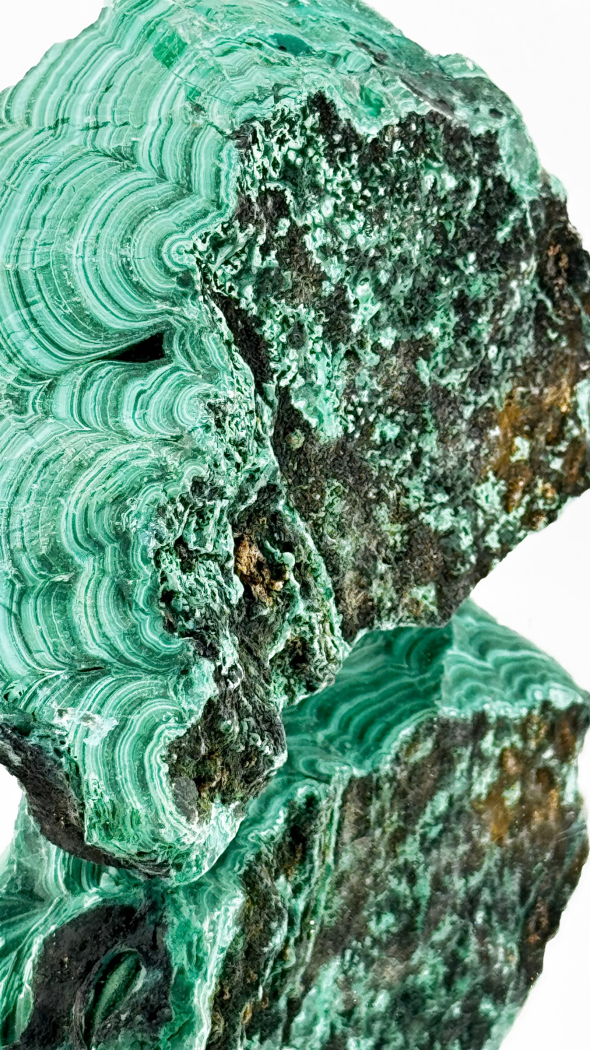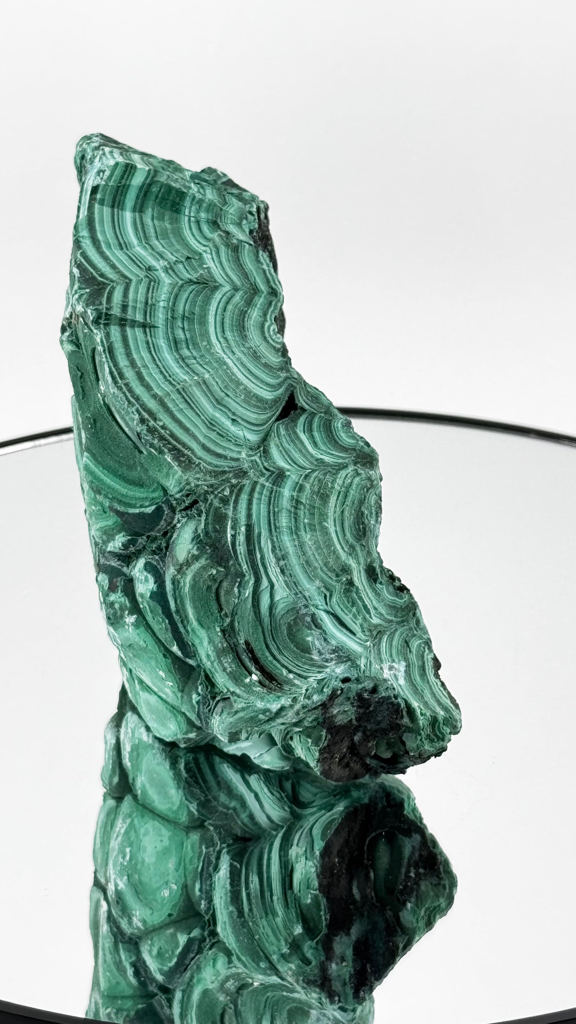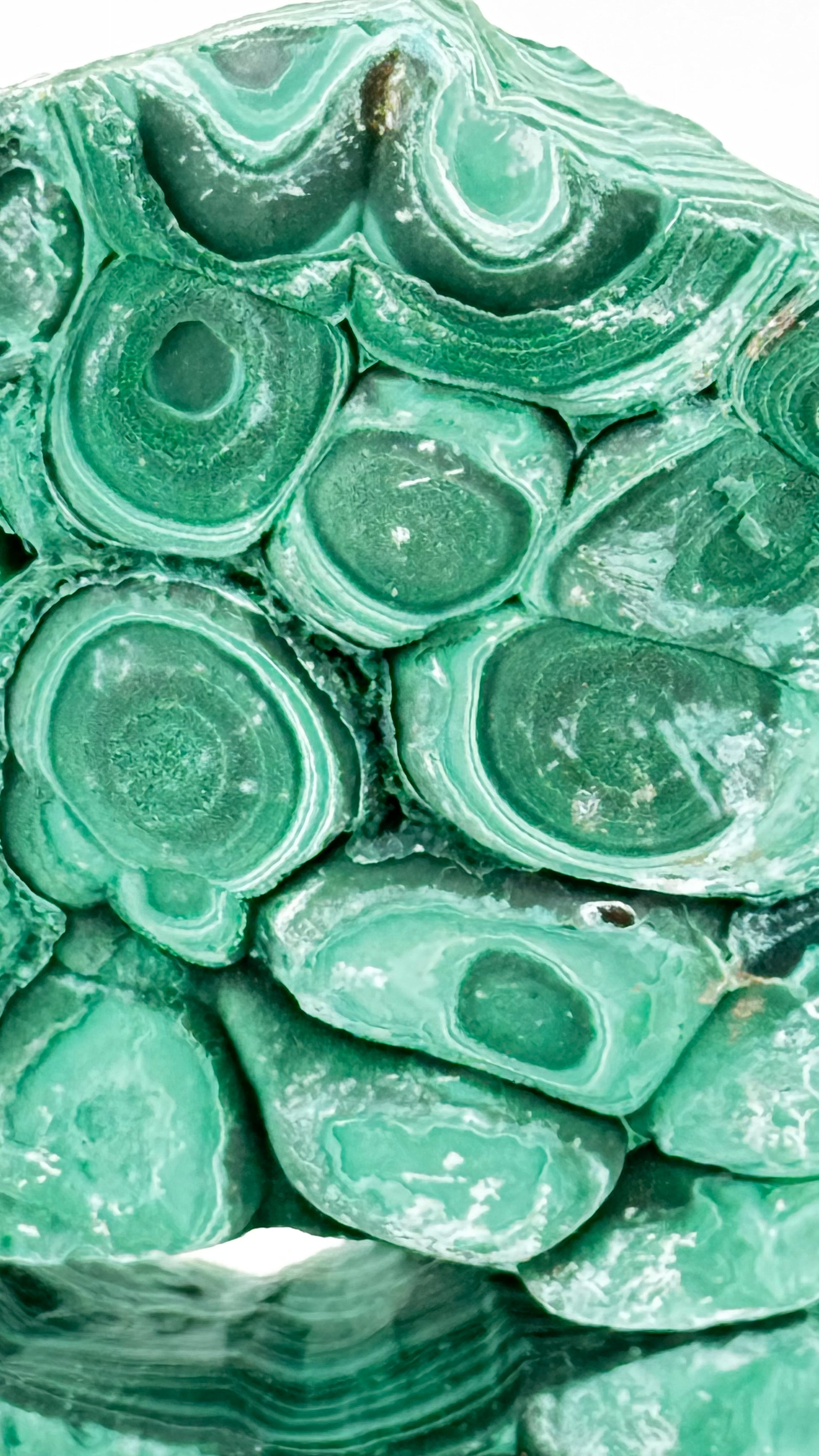 Die konzentrischen Bänder entstehen durch rhythmische Kristallisation von Kupferkarbonat in Hohlräumen kupferhaltiger Gesteine. Jede Schicht dokumentiert eine Phase der Mineralbildung – sichtbar gemacht durch unterschiedliche Grüntöne und Texturen. Die “Augen”-Muster (Pfauenaugen-Malachit) mit ihren kreisförmigen Strukturen sind besonders begehrt bei Sammlern und entstehen nur unter spezifischen geologischen Bedingungen.