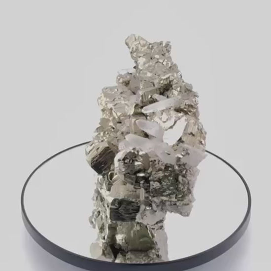 Ideal für anspruchsvolle Mineraliensammler, die Wert auf perfekte Kristallgeometrie, monumentale Größe und museale Qualität legen. Die Kombination aus goldenem Pyrit und klarem Bergkristall macht dieses Stück zu einem visuellen Highlight in jeder Sammlung.