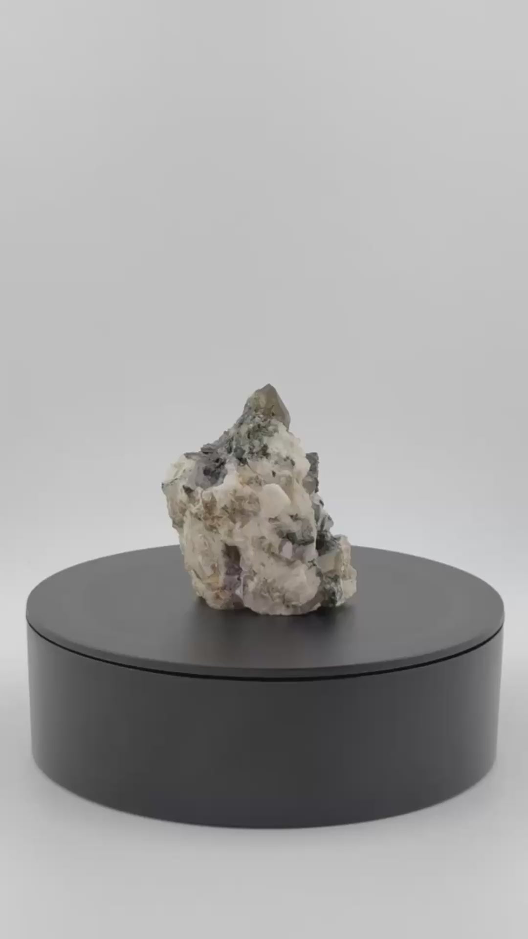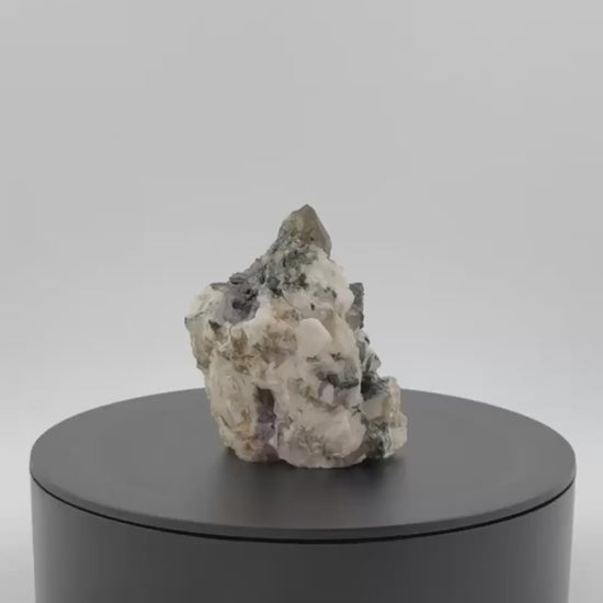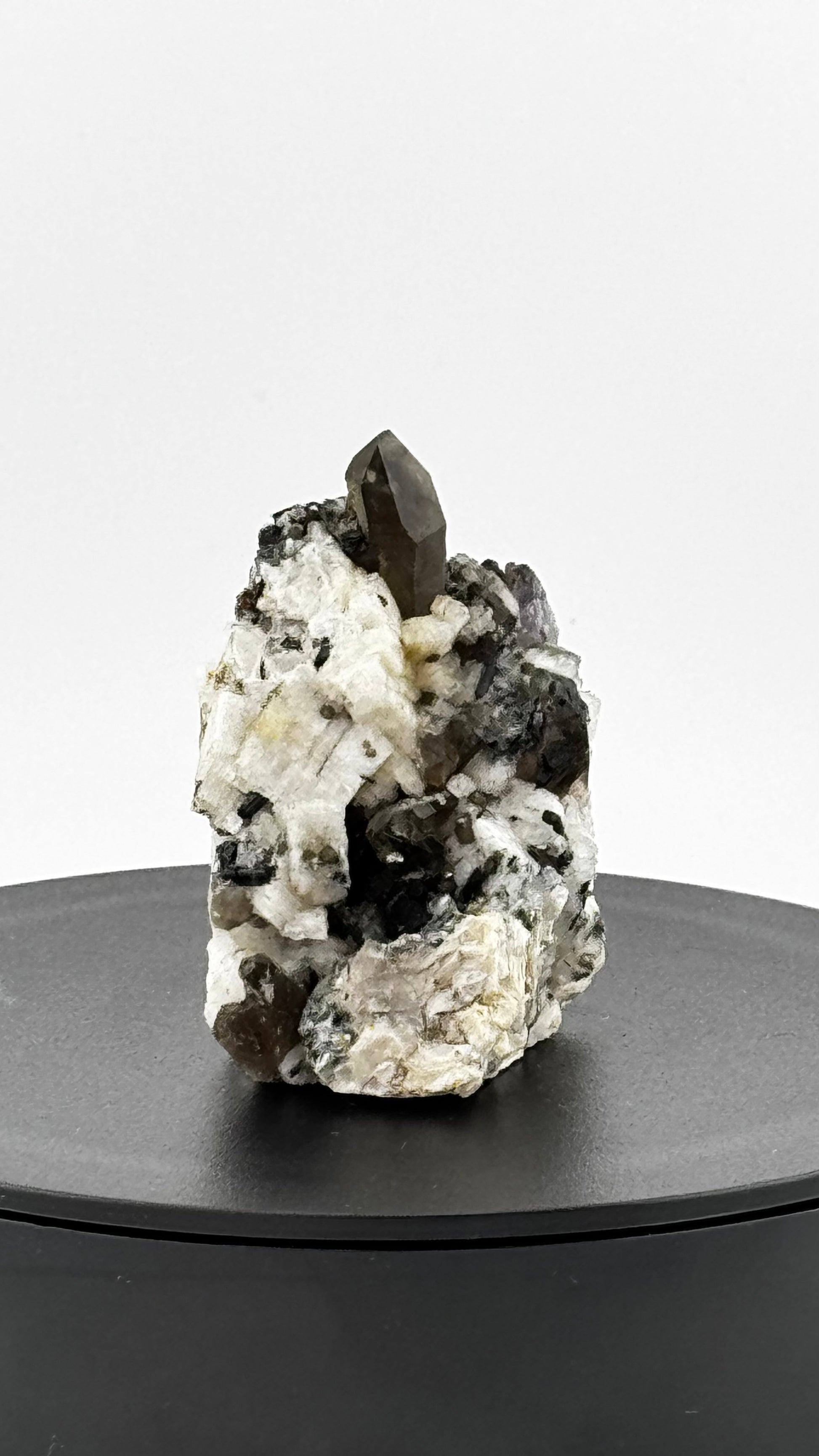 Das Stück zeigt eine natürliche Verwachsung von drei Mineralien: Ein terminierter Rauchquarz-Kristall auf einer Matrix aus weißem Flussspat, durchzogen von schwarzen Turmalin-Nadeln. Diese Kombination dokumentiert die geologische Vielfalt dieses Fundorts und macht jede Stufe zu einem mineralogischen Einzelstück.