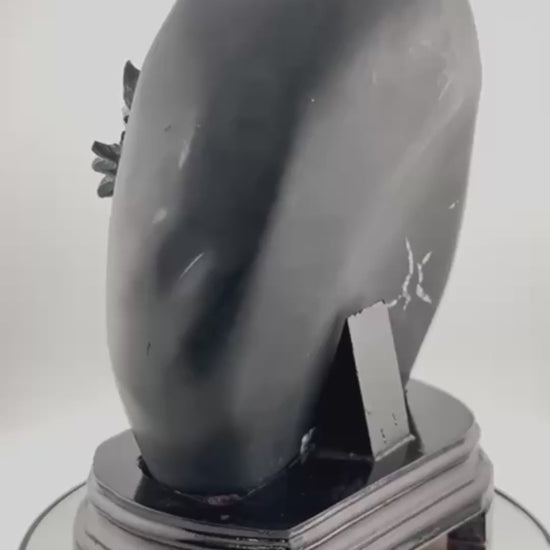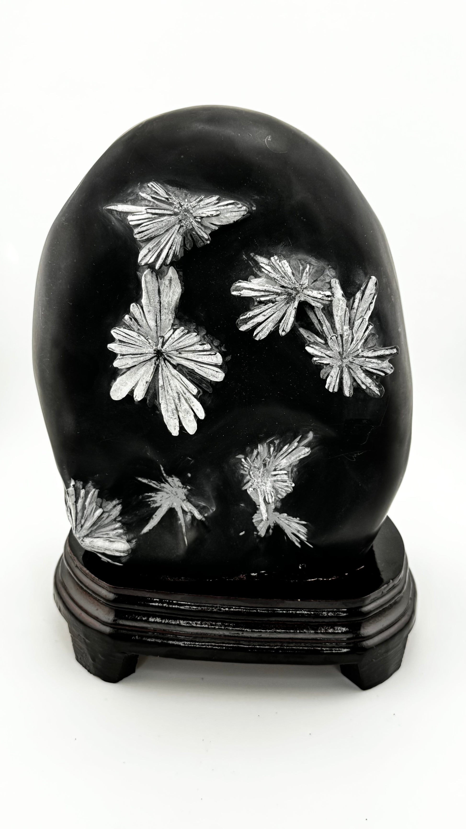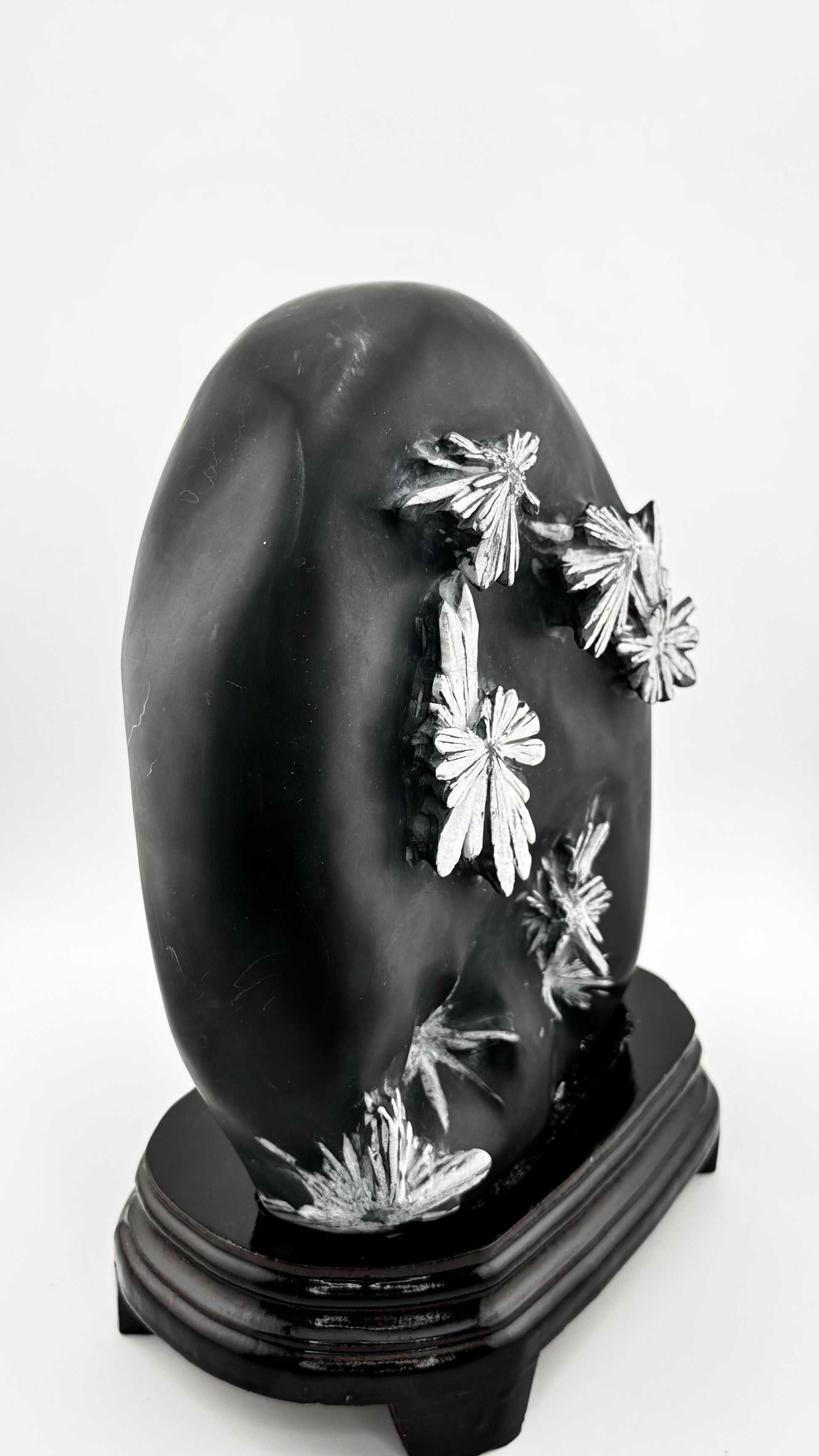 Der polierte schwarze Quarz-Hintergrund wurde präzise bearbeitet, um die natürlichen Stibnit-Rosetten optimal zur Geltung zu bringen. Die glatte, spiegelnde Oberfläche kontrastiert mit den dreidimensionalen, metallischen Kristallen und schafft einen Effekt, der an ostasiatische Lackarbeiten oder Seidenstickereien erinnert. Diese Kombination aus natürlicher Kristallisation und menschlicher Bearbeitung macht den “Chrysanthemen-Stein” zu einem Grenzobjekt zwischen Natur und Kunst.