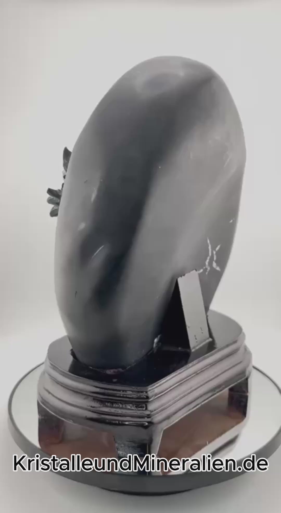 Das monumentale Mineral wird auf einem mitgelieferten Holzsockel im asiatischen Stil präsentiert, der die kulturelle Bedeutung des “Chrysanthemen-Steins” unterstreicht. Die Ei-Form und die perfekte Politur machen das Stück zu einem skulpturalen Objekt, das sowohl als Mineraliensammlung als auch als Kunstobjekt funktioniert.